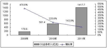 圖2 2009-2011年中國3G業務收入規模與增長預測