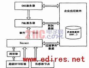 Savant軟件是處理從一個或多個解讀器獲得的標簽或傳感器數據(事件數據)流的“中間件”,是一種企業通用的數據管理架構,安裝在等級式、分布式的服務器上。本係統的Savant有三種數據來源,可以按傳統的方式從閱讀器而來,可以接受傳感器節點的信息,也可以接收超級RFID主動發出的信息。基於Savant的樹型等級結構,並根據其分類,定義了一種統一的層次化的Savant體係架構。依據Auto-ID標準委員會的定義,Savant應該包括三個必需的標準模塊:事件管理係統(EMS)、實時內存數據結構(RIED)和任務管理係統(TMS)。其它一些可選標準程序模塊可以根據用戶定義。圖3是Savant的體係結構。
