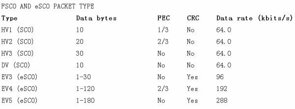 SCO提(ti)供(gong)了(le)全(quan)雙(shuang)工(gong)的(de)音(yin)頻(pin)。藍(lan)牙(ya)連(lian)接(jie)中(zhong)的(de)主(zhu)設(she)備(bei)發(fa)送(song)一(yi)個(ge)數(shu)據(ju)包(bao)給(gei)從(cong)設(she)備(bei),而(er)從(cong)設(she)備(bei)在(zai)接(jie)下(xia)來(lai)的(de)時(shi)隙(xi)中(zhong)給(gei)予(yu)響(xiang)應(ying)。盡(jin)管(guan)能(neng)夠(gou)對(dui)特(te)定(ding)的(de)包(bao)類(lei)型(xing)作(zuo)出(chu)選(xuan)擇(ze),這(zhe)個(ge)特(te)定(ding)的(de)包(bao)類(lei)型(xing)還(hai)是(shi)象(xiang)征(zheng)性(xing)地(di)被(bei)留(liu)在(zai)了(le)藍(lan)牙(ya)芯(xin)片(pian)組(zu)內(nei)的(de)連(lian)接(jie)管(guan)理(li)固(gu)件(jian)中(zhong)。藍(lan)牙(ya)技(ji)術(shu)定(ding)義(yi)了(le)傳(chuan)輸(shu)SCO的四個包類型(見表)。