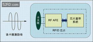 從結構上講,RFID是一個包含射頻模擬前端(RFAFE)和基帶信號處理兩大部分的單片集成電路(見圖1)。基帶係統包括控製邏輯(甚至微處理器)和必要的存儲器,AFE部分是RFID的能量與信號接口,提供片上基帶係統工作所需的電源和時鍾等輔助信號,完成數據的接收與發送功能。由於RFAFE屏蔽了智能卡片上的電源、時鍾、上電複位(POR)等信號與外界的聯係,在一定程度上減少了攻擊實施的點,與接觸式智能卡相比在安全性方麵有一定的提升。