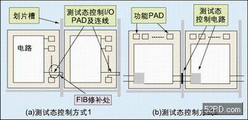 圖5a是在接觸式智能卡芯片的發展過程中曾大量采用的測試態控製方式:使用額外的I/O管腳和芯片內部電路相連,該連線通過劃片槽,這樣芯片劃斷後就不能通過簡單控製該管腳進入測試態。由於FIB修補技術的出現,這個手段已經過時。圖5b是最有潛力的替代方案:在劃片槽和鄰近的芯片中設計部分控製電路,從而得到不可逆的測試態控製手段。