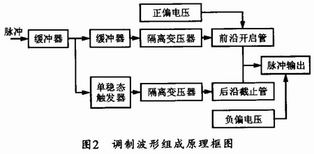 本調製器的組成原理框圖如圖2所示。圖中,當定時脈衝輸入到來時,經過緩衝器驅動後,該脈衝將分成兩路,分別提供給調製脈衝前沿開啟和後沿截止MOS管。其中前沿開啟脈衝經緩衝器驅動和三極管放大後,加到隔離升壓變壓器,以保證高速開啟管正常開啟;而後沿截止脈衝則使用後沿觸發的單穩態觸發電路形成,以保證形成的調製脈衝的寬度與定時脈衝的寬度一致。