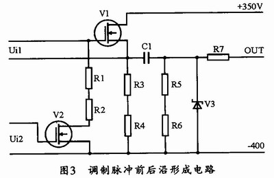 本調製器的調製脈衝前後沿形成使用的是BUZ50B,當Ui2使得V2導通時,負偏電壓將使V1迅速截止。這樣形成的調製脈衝就能夠具有非常良好的後沿波形。其電路圖如圖3所示。