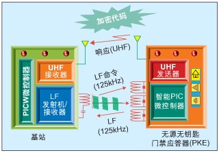 在這些應用中,基站用125 kHz頻率發送命令,同時等待附近的有效應答器以UHF頻率發回響應。智能應答器一般處於接收模式並等待任何有效的125kHz基站命令。如果接收到任何有效的基站命令,應答器以UHF頻率發送響應。這就是我們所說的“無源無鑰匙門控係統”。由於PKE係統采用125kHz電路進行雙向通信,因此低成本、小體積及低功耗PKE應答器可使用含有數字與低頻前端的集成係統級芯片(SoC) 智能微控製器單元(MCU)來生產。