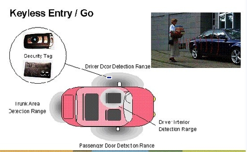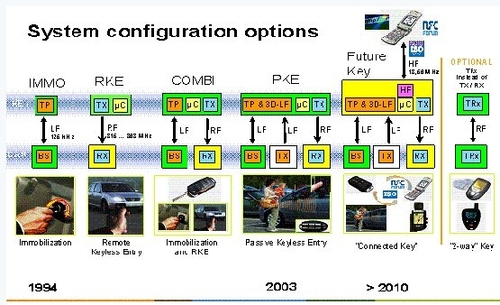 2003,NXP推出了無鑰匙係統(PKE或稱PEPS),徹底改變了汽車安防應用領域的發展前景,給用戶帶來了全新舒適與便利的體驗:chezhuzaizhenggejiacheguochengzhongdouwanquanbuxuyaoshiyongyaochi,zhixuyaosuishenxiedai。dangchezhujinruchezifujindeyouxiaofanweishi,chezihuizidongjianceyaochibingjinxingshenfenshibie,ruchenggonghuixiangyingdedakaichemenhuohoubeixiang;dangchezhujinruchenei,zhixuyaoanyinqingqidonganniu,chezihuizidongjianceyaochideweizhi,panduanyaochishifouzaichenei,shifouzaizhujiaweizhi,ruchenggongzefadongyinqing。qianwanbuyaoxiaoqiaozhegekansibuqiyandegaibian,tazaijianhuanideshenghuofangmianfahuizhezhongdazuoyong。wuyaochixitongjuebujinjinshidailaileshushiyufangbian,qizaianquanxingfangmianyeyoulebenzhidetigao,tongguodipinheshepindeshuangxiangtongxun,qicheyuyaochizhijiankeyiwanchengfuzadeshuangxiangshenfenrenzheng,zaianquanxingfangmianyuyinqingfangdaoleisi,yaoyuanhaoyuchuantongdeyaokongyaochi。cong2003年少量高端車型成功量產無鑰匙係統開始,全球市場用了兩到三年的時間推廣普及這一技術,目前,幾乎全球每一個主流車廠都有應用NXP的無鑰匙產品,覆蓋中高端的車型,甚至是低端車型。
