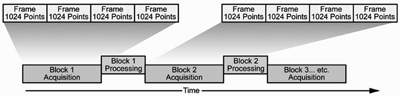 圖5是shi塊kuai采cai集ji模mo式shi,可ke以yi實shi現xian實shi時shi無wu縫feng捕bu獲huo。對dui塊kuai內nei部bu的de所suo有you幀zhen,每mei個ge采cai集ji在zai時shi間jian上shang都dou是shi無wu縫feng的de。在zai一yi個ge采cai集ji塊kuai中zhong的de信xin號hao處chu理li完wan成cheng後hou,將jiang開kai始shi采cai集ji下xia一yi個ge塊kuai。塊kuai存cun儲chu在zai內nei存cun中zhong,可ke以yi應ying用yong任ren何he實shi時shi測ce量liang。例li如ru,實shi時shi頻pin譜pu模mo式shi下xia捕bu獲huo的de信xin號hao可ke以yi在zai解jie調tiao模mo式shi和he時shi間jian模mo式shi下xia分fen析xi。