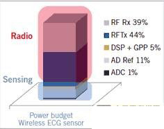 與(yu)人(ren)們(men)的(de)預(yu)測(ce)相(xiang)反(fan),當(dang)用(yong)通(tong)用(yong)微(wei)控(kong)製(zhi)器(qi)執(zhi)行(xing)本(ben)地(di)處(chu)理(li)時(shi),傳(chuan)感(gan)器(qi)節(jie)點(dian)的(de)功(gong)耗(hao)會(hui)增(zeng)加(jia)。射(she)頻(pin)組(zu)件(jian)的(de)功(gong)耗(hao)會(hui)降(jiang)低(di),原(yuan)因(yin)是(shi)它(ta)沒(mei)有(you)太(tai)多(duo)的(de)數(shu)據(ju)要(yao)發(fa)送(song),而(er)商(shang)用(yong)微(wei)控(kong)製(zhi)器(qi)的(de)功(gong)耗(hao)猛(meng)曾(zeng),原(yuan)因(yin)是(shi)它(ta)沒(mei)有(you)針(zhen)對(dui)這(zhe)類(lei)處(chu)理(li)做(zuo)優(you)化(hua)。基(ji)於(yu)這(zhe)個(ge)原(yuan)因(yin),IMEC和霍爾斯特中心開發了一款專用超低功耗DSP,它針對腦電圖、心電圖、眼電圖及肌電圖等生理參數做了優化。