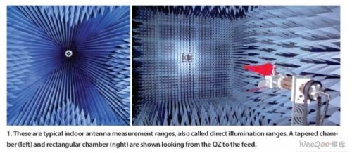 在傳統的遠場天線測試場中,發射和接收天線分別位於對方的遠場處,兩者通常隔得足夠遠以模擬想要的工作環境。AUT被距離足夠遠的源天線所照射,以便在AUT的(de)電(dian)氣(qi)孔(kong)徑(jing)上(shang)產(chan)生(sheng)接(jie)近(jin)平(ping)麵(mian)的(de)波(bo)陣(zhen)麵(mian)。遠(yuan)場(chang)測(ce)量(liang)可(ke)以(yi)在(zai)室(shi)內(nei)或(huo)室(shi)外(wai)測(ce)試(shi)場(chang)進(jin)行(xing)。室(shi)內(nei)測(ce)量(liang)通(tong)常(chang)是(shi)在(zai)微(wei)波(bo)暗(an)室(shi)中(zhong)進(jin)行(xing)。這(zhe)種(zhong)暗(an)室(shi)有(you)矩(ju)形(xing)的(de),也(ye)有(you)錐(zhui)形(xing)的(de),專(zhuan)門(men)設(she)計(ji)用(yong)來(lai)減(jian)少(shao)來(lai)自(zi)牆(qiang)體(ti)、地板和天花板的反射(圖1)。在矩形微波暗室中,采用一種牆麵吸波材料來減少反射。在錐形微波暗室中,錐體形狀被用來產生照射。