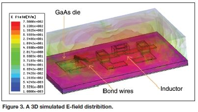第(di)二(er)個(ge)關(guan)注(zhu)的(de)地(di)方(fang)是(shi)微(wei)帶(dai)線(xian)附(fu)近(jin)的(de)場(chang)線(xian),在(zai)靠(kao)近(jin)地(di)平(ping)麵(mian)的(de)地(di)方(fang)它(ta)們(men)最(zui)強(qiang)。隻(zhi)要(yao)屏(ping)蔽(bi)和(he)地(di)平(ping)麵(mian)間(jian)的(de)距(ju)離(li)明(ming)顯(xian)大(da)於(yu)微(wei)帶(dai)線(xian)和(he)地(di)平(ping)麵(mian)間(jian)的(de)距(ju)離(li),則(ze)增(zeng)加(jia)的(de)屏(ping)蔽(bi)的(de)效(xiao)用(yong)就(jiu)微(wei)乎(hu)其(qi)微(wei)。線(xian)綁(bang)定(ding)和(he)表(biao)貼(tie)電(dian)感(gan)與(yu)地(di)平(ping)麵(mian)的(de)直(zhi)接(jie)耦(ou)合(he)要(yao)弱(ruo)些(xie),當(dang)施(shi)加(jia)屏(ping)蔽(bi)時(shi),預(yu)期(qi)其(qi)場(chang)線(xian)會(hui)有(you)變(bian)化(hua)。圖(tu)3顯示的是3D模擬的E場分布。
