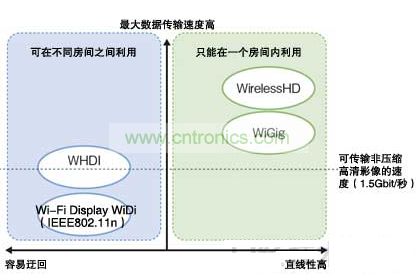 Wi-Fi Display、WiDi和WHDI因電波比較容易迂回,適用於在不同房間的連接,采用60GHz頻帶毫米波的WirelessHD和WiGig雖然可以確保傳輸速度,但如果有障礙物的話,電波難以到達,因此主要在一個房間內使用。