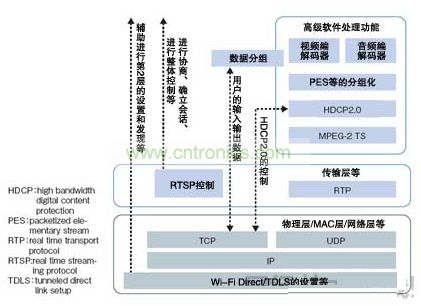 Wi-Fi Display是以無需經由WLAN接入點即可在終端間直接通信的標準“Wi-Fi Direct”為基礎,由上層的協議棧軟件構成的安裝指南。鎖定終端服務的“服務發現(Service Discovery)”等的處理利用Wi-Fi Direct進行,影像的壓縮/解壓處理及管理數據流的傳輸層等利用Wi-Fi Display處理(圖2)。壓縮/解壓采用H.264格式。由於最近的智能手機不但標配WLAN功能,采用內置H.264編解碼器電路GPU的終端也很多,因此Wi-Fi Display還具有易於配備到終端中的特點。“在受限於安裝麵積和耗電量的智能手機中,無需追加硬件即可配備的優勢非常大”(Cavium公司的柴田)。