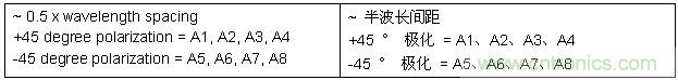 此例為一個 8 陣元物理天線,采用兩組天線單元配置。兩組天線單元彼此以 90 正交交叉極化。天線組 0 包括天線單元 1 至 4,以 +45 進行極化。天線組 1 包括天線單元 5 至 8,以 -45進行極化。