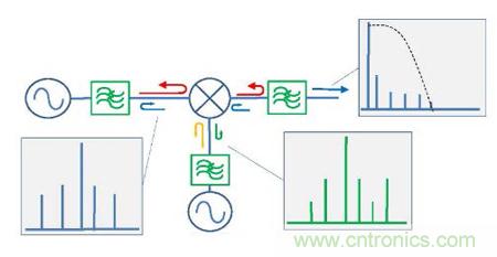 在zai電dian路lu設she計ji中zhong,對dui於yu傳chuan統tong反fan射she式shi濾lv波bo器qi常chang常chang產chan生sheng的de問wen題ti,無wu反fan射she濾lv波bo器qi特te別bie適shi用yong於yu配pei對dui那na些xie敏min感gan的de非fei線xian性xing器qi件jian。舉ju一yi個ge典dian型xing案an例li,比bi如ru濾lv波bo器qi在zai混hun頻pin器qi輸shu出chu信xin號hao鏈lian路lu上shang的de應ying用yong。混hun頻pin器qi會hui產chan生sheng大da量liang的de無wu用yong混hun頻pin信xin號hao、來(lai)自(zi)本(ben)振(zhen)的(de)高(gao)次(ci)諧(xie)波(bo)以(yi)及(ji)其(qi)他(ta)無(wu)用(yong)頻(pin)率(lv)信(xin)號(hao),這(zhe)是(shi)必(bi)須(xu)濾(lv)除(chu)掉(diao)的(de)。然(ran)而(er),如(ru)果(guo)使(shi)用(yong)傳(chuan)統(tong)設(she)計(ji)的(de)濾(lv)波(bo)器(qi),可(ke)能(neng)會(hui)導(dao)致(zhi)這(zhe)些(xie)信(xin)號(hao)反(fan)射(she)回(hui)混(hun)頻(pin)器(qi)中(zhong)重(zhong)新(xin)轉(zhuan)換(huan),或(huo)是(shi)與(yu)有(you)用(yong)信(xin)號(hao)進(jin)行(xing)新(xin)的(de)混(hun)頻(pin),產(chan)生(sheng)大(da)量(liang)意(yi)想(xiang)不(bu)到(dao)的(de)無(wu)用(yong)信(xin)號(hao)。並(bing)且(qie)很(hen)可(ke)能(neng)這(zhe)些(xie)無(wu)用(yong)信(xin)號(hao)正(zheng)好(hao)處(chu)於(yu)濾(lv)波(bo)器(qi)通(tong)帶(dai)內(nei)而(er)無(wu)法(fa)濾(lv)除(chu)。