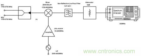 測試框圖如圖11所示。其中,RF1信號用於變頻損耗測試,RF2信號用於幹擾RF1和IP3測試。將測試以下3種不同狀態: