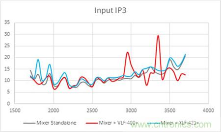 同樣的,在IP3的測試曲線也顯示了混頻器輸出端配對傳統濾波器後導致的不穩定曲線。而使用無反射式濾波器配對混頻器的輸出端則使得IP3性能與混頻器本身的IP3性能保持一致。