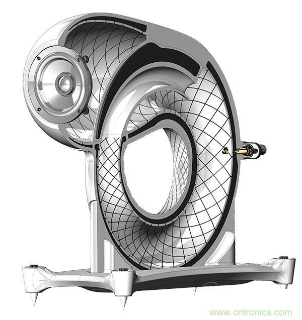 為了不必使用聲波吸收就能夠解決這個問題,畢業於以色列Bezalel藝術與設計學院的工業設計師Boaz Dekel提出了一個非常獨特的解決方案:去掉音箱的後壁。簡單地說,Dekel構思了一個圓形音箱Aleph1。在這個音箱裏,向後的聲音會進入“一個永久的自送(self-feeding)回路,以防止它被直接反彈回去,幹擾到向前輸出的聲音信號。”Dekel解釋說。