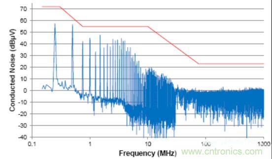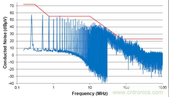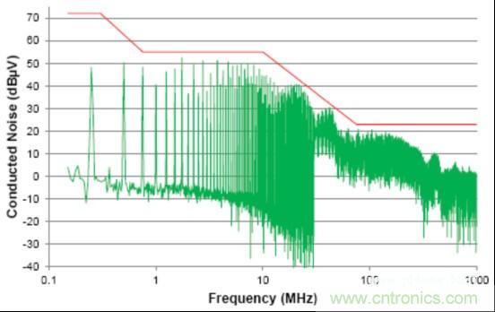 由於信號的共模部分能夠與係統(或與外部係統)中的其它分量耦合在一起(通過輻射或傳導路徑),這個共模噪聲直接影響放射性能。這個器件的傳導放射按照工業電氣工程/電子 (IBEE) 茨維考技術的工程服務進行測量;如圖2中所示,這個器件的傳導放射連同一個普通汽車原始設備製造商(OEM)限值線一同繪製。