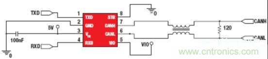 此外,當CANH和CANL線路在顯性和隱性狀態之間變換時,它們之間的變換時間和定時偏移需要良好匹配,以限製出現在高頻頻帶內的共模噪聲。