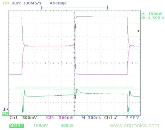 圖1中的波形顯示了一個可以在典型CAN收發器的輸出上觀察到的共模噪聲。在這幅圖像中,黑色軌跡線(通道1)顯示CANH,紫色軌跡線(通道 2)顯示的是CANL,並且綠色軌跡線(數據功能)是CANH與CANL的和。這個求和的過程給出了一個波形,它的值等於此時一個指定點上共模電壓的2 倍。