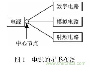 星形布線是模擬電路設計中眾所周知的技巧(如圖1所示) 。星形布線———電路板上各模塊具有各自的來自公共供電電源點的電源線路。在這種情況下,星形布線意味著電路的數字部分和RF 部分應有各自的電源線路,這些電源線應在靠近IC 處分別去耦。這是一個隔開來自數字