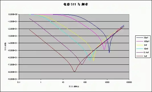 給出了不同容值下的典型S11參數,從這些曲線可以清楚地看到SRF,還可以看出電容越大,在較低頻率處所提供的去耦性能越好(所呈現的阻抗越低)。