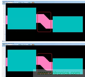 射頻和微波電路中經常用到倒角,以減小供給線與電容之間的分段不連續性阻抗,從而改善 MMIC 的頻率性能。90º拐角與倒角之間的距離至關重要。因此,設計人員需要采用自動方法來基於設計指定需要產生的倒角比率。PCB設計工具如果能夠基於設計規則自動強製實施需要產生的倒角比率,設計人員和工程師將會從中受益,在節省時間的同時提高設計質量(圖 3)。
