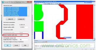 設計用於射頻和微波的銅箔形狀時,一個很重要的方麵是能夠建立帶尖拐角的 Gerber檔。優秀的PCB設計工具可以簡化這一過程。例如,使用50毫米線條繪製形狀與使用50毫米圓形光圈繪圖相比,往往令設計具有較小的半徑。設計工具在建立Gerber檔時,可透過正確地自動轉換線條寬度來獲得尖拐角(圖 2)。