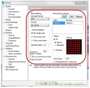射頻設計的另一個重要方麵是確保正確地利用vias屏蔽特定的區域。盡管此任務可由設計人員手動進行,但這個過程極其耗時。如果PCB設計工具能夠自動完成此過程,將可以縮短設計周期時間並確保符合您的所有設計規則。利用此類工具,設計人員可以指定via模式產生特定規則,而將剩餘的工作全部交由PCB設計工具完成。