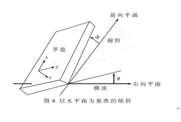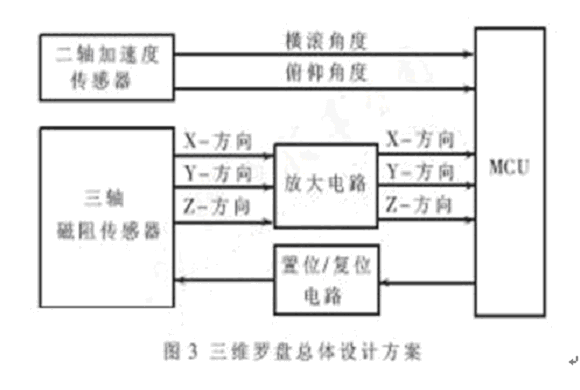 地球磁場的強度為0.6高(gao)斯(si)左(zuo)右(you),現(xian)有(you)的(de)磁(ci)阻(zu)傳(chuan)感(gan)器(qi)可(ke)以(yi)很(hen)好(hao)地(di)測(ce)量(liang)地(di)磁(ci)場(chang)範(fan)圍(wei)內(nei)的(de)磁(ci)場(chang)強(qiang)度(du)。由(you)於(yu)二(er)維(wei)羅(luo)盤(pan)隻(zhi)能(neng)在(zai)保(bao)持(chi)水(shui)平(ping)的(de)情(qing)況(kuang)下(xia)正(zheng)常(chang)工(gong)作(zuo),如(ru)果(guo)用(yong)於(yu)車(che)輛(liang)的(de)動(dong)態(tai)環(huan)境(jing)中(zhong),將jiang不bu可ke能neng保bao證zheng其qi永yong遠yuan水shui平ping,所suo以yi在zai這zhe種zhong場chang合he下xia,羅luo盤pan的de可ke使shi用yong性xing大da大da降jiang低di。於yu是shi需xu要yao設she計ji三san維wei羅luo盤pan以yi適shi應ying各ge種zhong姿zi態tai的de測ce量liang。三san維wei電dian子zi羅luo盤pan的de總zong體ti設she計ji方fang案an如ru圖tu3所示。三軸磁阻傳感器分別從X、Y、Z 三個磁場強度方向輸出電壓,經過放大電路分別輸入到三個具有A/D轉換能力的MCU端口,二軸加速度傳感器測量俯仰角度和橫滾角度,測量參數的意義如圖4所示。