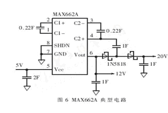 在HMC1055芯片上,置位/複位片的引腳名稱是S/R+和S/R-,沒有極性的區別,單個置位/複位帶標準阻值為2.0Ω,所以對於三軸係統,三個金屬片串聯阻值為6.0Ω,則產生一個3~4A的最小脈衝驅動一個6Ω的負載所需的供電電壓為18V~24V。由於係統芯片都是使用5V電源,所以需要將5V電壓升壓到20V左右,可以使用MAX662來完成。典型的電路如圖6所示。
