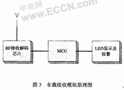 本文設計了一種直接式TPMS,其原理如圖1所示。該係統由兩部分組成,輪胎模塊和車載接收模塊。其中,輪胎模塊包括壓力和溫度傳感器、A/D變換器、控製器及射頻發射器等,如圖2所示。車載接收模塊包括了射頻接收器、控製器以及顯示報警裝置等,如圖3所示。