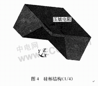 其中,壓阻式壓力傳感器主要是利用半導體的壓阻效應,把一個惠斯通電橋做在一個矽杯上,如圖4所示。當矽杯受到壓力後發生形變,惠斯通電橋的四個橋臂電阻就會發生變化,打破了電橋的電平衡,從而會有一個電信號的輸出。
