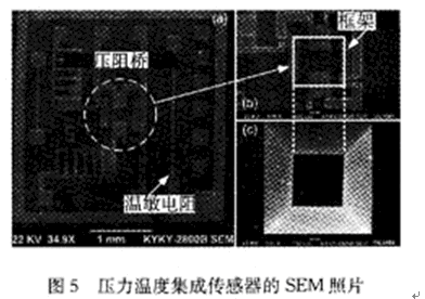 圖5是本文製作的傳感器芯片的電鏡照片。圖5(a)為器件正麵全貌;圖5(b)為薄膜正麵;圖5(c)為薄膜背麵。其中壓敏元件采用比常規更厚的50μm矽杯薄膜(500 μm×500μm),增zeng大da了le體ti矽gui上shang高gao應ying力li區qu的de麵mian積ji,在zai降jiang低di工gong藝yi要yao求qiu的de同tong時shi提ti高gao了le線xian性xing測ce量liang範fan圍wei和he過guo載zai壓ya力li。壓ya敏min電dian阻zu設she計ji為wei折zhe線xian結jie構gou,采cai用yong優you化hua的de幾ji何he尺chi寸cun,並bing將jiang其qi部bu分fen製zhi作zuo在zai高gao應ying力li體ti矽gui上shang以yi獲huo得de更geng高gao靈ling敏min度du。體ti矽gui上shang的de溫wen敏min電dian阻zu隨sui壓ya敏min電dian阻zu利li用yong同tong步bu注zhu入ru工gong藝yi製zhi作zuo,減jian小xiao了le工gong藝yi複fu雜za度du。該gai器qi件jian工gong藝yi簡jian單dan,成cheng品pin率lv高gao,與yu標biao準zhunIC工藝兼容。