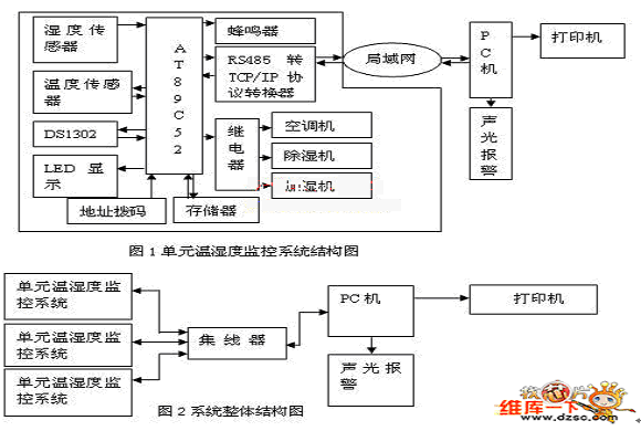每個溫濕度監控儀由單片機、溫度傳感器、濕度傳感器、DS1302、LED數碼管顯示模塊、地址撥碼模塊、外部存儲器、蜂鳴器、空調機、除濕機、加濕機等組成。128個具有獨立地址的溫濕度監控儀通過RS485總線並聯在一起,再通過一個RS485轉TCP/IP協議轉換器可直接與微機之間進行網絡通訊從而組成一個單元溫濕度監控係統(單元溫濕度監控係統結構圖見圖1)。