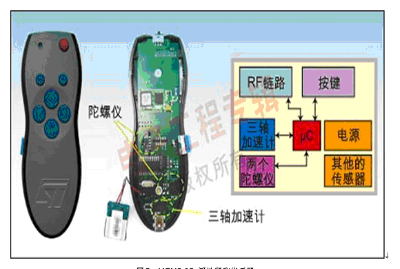 MEMS加速計與陀螺儀配合使用,可以把更先進的選擇功能變為現實,例如:能夠在空中操作的三維鼠標和遙控器。在這些設備中,傳感器檢測到用戶的手勢,將其轉換成PC屏幕上的光標移動或機頂盒和電視機的頻道和功能選擇。圖5是一個含有MEMS傳感器的遙控器解決方案,MEMS傳感器組、兩liang個ge陀tuo螺luo儀yi和he一yi個ge加jia速su計ji檢jian測ce手shou腕wan或huo鼠shu標biao在zai空kong中zhong的de動dong作zuo,同tong時shi微wei控kong製zhi器qi執zhi行xing動dong作zuo跟gen蹤zong和he手shou勢shi識shi別bie功gong能neng。然ran後hou,重zhong組zu的de運yun動dong曲qu線xian通tong過guo無wu線xian連lian接jie發fa送song到dao機ji頂ding盒he或huoPC機,無線鏈路可以采用紅外或射頻,具體視應用要求而定。