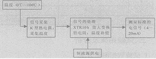 熱電偶作為感溫元件,采集溫度信號;鉑電阻作為補償電阻,補償熱電偶的冷端溫度;XTR101為小信號處理專用芯片,將輸入的微弱信號放大後便於遠端傳輸;RL為遠端的負載電阻,便於電信號的測量。