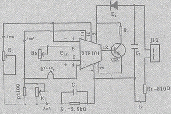 XTR101是一個精密、低漂移的雙線變送器,它可以把微弱的電壓信號進行放大並變換成4mA~20mA的電流信號後進行遠距離傳送。它由一個高精度的儀表放大器、壓控輸出電流源和2個精密的1mA電流源組成。