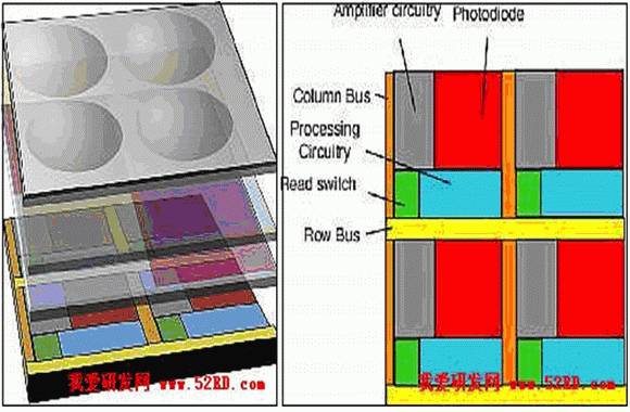 位於最上層的為 MicroLens 微型聚光鏡片。盡管CCD 在影像品質等各方麵均優於CMOS,但不可否認的CMOS具有低成本、低耗電以及高整合度的特性。 由於數位影像的需求熱烈,CMOS的低成本和穩定供貨,成為廠商的最愛,也因此其製造技術不斷地改良更新,使得 CCD 與 CMOS 兩者的差異逐漸縮小 。新一代的CCD朝向耗電量減少作為改進目標,以期進入照相手機的行動通訊市場;CMOS係列,則開始朝向大尺寸麵積與高速影像處理晶片統合,藉由後續的影像處理修正雜訊以及畫質表現,特別是 Canon 係列的 EOS D30 、EOS 300D 的成功,足見高速影像處理晶片已經可以勝任高畫素 CMOS 所產生的影像處理時間與能力的縮短;另外,大尺寸全片幅則以 Kodak DCS Pro14n、DCS Pro/n、DCS Pro/c 這一係列的數位機身為號召,CMOS未來跨足高階的影像市場產品,前景可期。