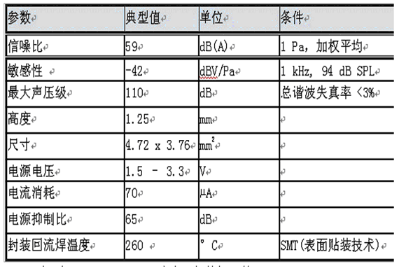 表1:新型SMM310矽基MEMS麥克風的特性參數。