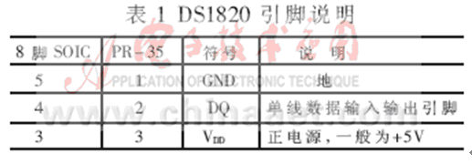 DS1820的PR-35封裝形式見圖1,其外表看起來像三極管。另外還有8腳SOIC封裝形式,隻用3、4和5腳,其餘為空腳或不需連接引腳。不過最常見的形式是PR-35封裝,其引腳說明如表1所示。