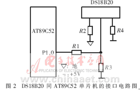 DS18B20的測溫原理為:內nei部bu計ji數shu器qi對dui一yi個ge受shou溫wen度du影ying響xiang的de振zhen蕩dang器qi的de脈mai衝chong計ji數shu,低di溫wen時shi振zhen蕩dang器qi的de脈mai衝chong可ke以yi通tong過guo門men電dian路lu,而er當dang到dao達da某mou一yi設she置zhi高gao溫wen時shi,振zhen蕩dang器qi的de脈mai衝chong無wu法fa通tong過guo門men電dian路lu。計ji數shu器qi設she置zhi為wei-55℃時的值,如果計數器到達0之前門電路未關閉,則溫度寄存器的值將增加,這表示當前溫度高於-55℃。tongshi,jishuqifuweizaidangqianwenduzhishang,dianluduizhendangqidewenduxishujinxingbuchang,jishuqizhongxinkaishijishuzhidaohuiling。ruguomendianlurengranweiguanbi,zezhongfuyishangguocheng。wenduzhuanhuansuoxushijianbuchaoguo750ms,得到的溫度值的位數因分辨率不同而不同[2]。DS18B20同AT89C52單片機的接口電路如圖2所示。這種接口方式隻需占用單片機一根口線,與智能儀器或智能測控係統中的其它單片機或DSP的接口也可采用類似的方式。
