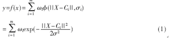 上式中,m是隱含層結點數;||•||是歐幾裏德範數;X,Ci∈Rn, ωi是第i個基函數與輸出結點的連接權值(i=1,2,...,m)。