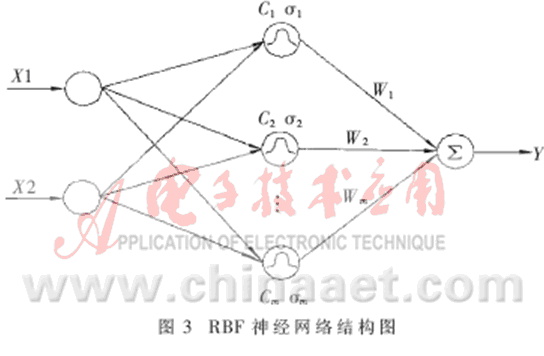 RBF神經網絡即徑向基函數(Radial Basis Function)神經網絡[3~4],其結構如圖3所示。它很容易擴展到多輸出節點的情形,在此隻考慮一個輸出變量Y的情況。RBFNN包括一個輸入層、一個隱含層和一個輸出層的最簡模式。隱含層由一組徑向基函數構成,與每個隱含層節點相關的參數向量為Ci(即中心)和σi(即寬度)。徑向基函數有多種形式,一般取高斯函數[5]。具體如下: