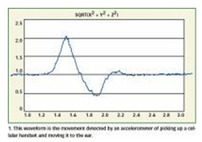 圖1:圖中波形是檢測拿起手機並送到耳邊這個動作的加速計所測到的姿態運動。