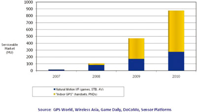 市場調研機構iSuppli認為,移動傳感器(motion sensors)將代替傳統的傳感器成為MEMS市場的主要推動力,至少在2012年之前會是這樣。尤其是加速計(accelerometer),它在便攜式消費電器中將被用來啟動一係列高級界麵功能。傳感器在消費電器中的應用正在迅速飆升,像用於遊戲、筆記本電腦和數碼相機中的移動傳感器就是實例。雖然以傳感器為基礎的微型機電係統(MEMS-microelectromechanical systems)的價格已經在迅速下降,它們還是太昂貴而不能被用在一些對價格敏感的消費產品中。