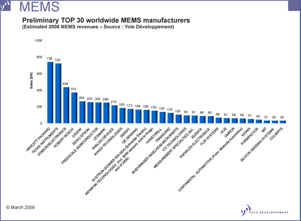 Yole發布2008年MEMS廠商排名 HP和TI保持領先