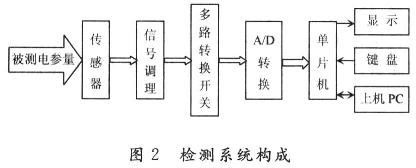 檢測係統構成如圖2,被測量經霍爾傳感器轉換為電壓信號,經信號調理電路和多路轉換開關選擇,通過A/D轉換器送給單片機,單片機采用89C51,是該係統的主控器,鍵盤選用2×4鍵盤,用於選擇被測量的種類,采用數碼管或液晶顯示被測量的大小。