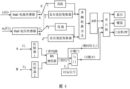 測量原理如圖4所示,交直流電壓、電流經霍爾電流傳感器、霍爾電壓傳感器隔離、轉換後,得到與之對應的電壓信號,再經真有效值轉換器轉換為直流(直流電不需轉換),其大小正比於交流電的有效值,直流(或轉換後的直流)電壓經A/D變換後送入單片機,這就采集到了U,I的大小。