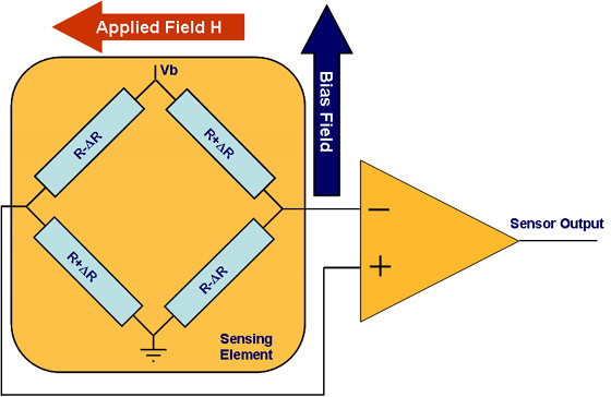 當dang在zai一yi個ge很hen薄bo的de鐵tie條tiao上shang施shi加jia磁ci力li線xian方fang向xiang與yu經jing過guo鐵tie條tiao的de電dian流liu方fang向xiang垂chui直zhi的de磁ci場chang時shi,鐵tie條tiao內nei的de電dian阻zu就jiu會hui發fa生sheng變bian化hua。這zhe種zhong傳chuan感gan器qi通tong常chang采cai用yong單dan臂bi電dian橋qiao形xing式shi,如ru圖tu所suo示shi,電dian橋qiao由you靜jing態tai阻zu值zhi相xiang同tong的de磁ci阻zu構gou成cheng。在zai測ce量liang過guo程cheng中zhong,電dian橋qiao上shang施shi加jia電dian壓yaVb,使電流通過電阻。隻要磁場H存在,在兩組四個相反放置的電阻器中,第一組兩個電阻的磁化矢量轉向電流,使電阻值變大;而另兩個電阻的磁化矢量背離電流,使電阻值變小。在線性範圍內,傳感器輸出與所施加的磁場強度成正比。