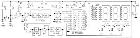IC2、X1、R10、C5等組成單片機電路。單片機對由P3.2輸入的脈衝信號進行計算處理後,送到數碼管顯示。發光二極管VD3作脈搏測量狀態顯示,脈搏每跳動一次,VD3點亮一次。